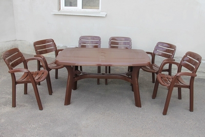 Главная / Пластиковая мебель / Наборы пластиковой мебели / Набор пластиковой мебели стол прямоугольный Премиум и 6 кресел Далгория (шоколад)