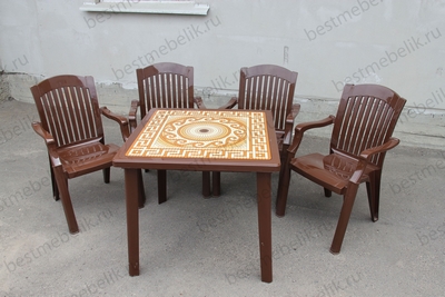 Главная / Пластиковая мебель / Наборы пластиковой мебели / Набор пластиковой мебели стол квадратный Греческий орнамент и 4 кресла Премиум (шоколад)