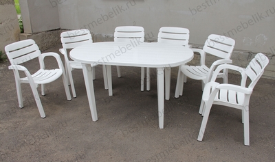 Главная / Пластиковая мебель / Наборы пластиковой мебели / Набор пластиковой мебели стол овальный и 6 кресел Далгория (белый)