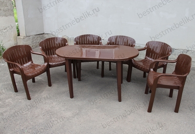 Главная / Пластиковая мебель / Наборы пластиковой мебели / Набор пластиковой мебели стол овальный и 6 кресел Летнее (шоколад)